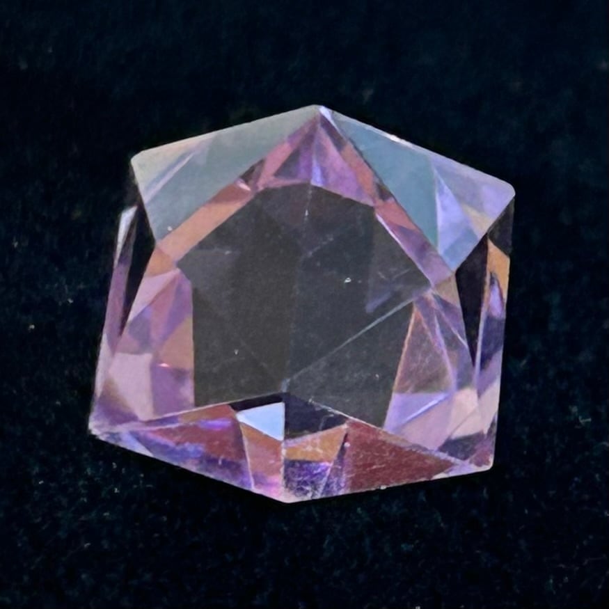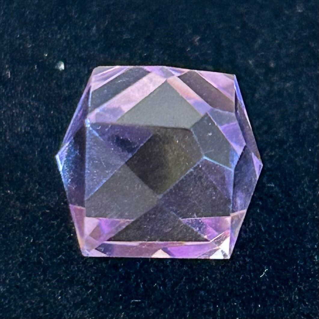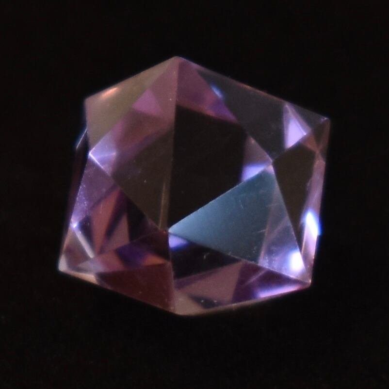 当製作所の人気作品のひとつ、「紙風船」をアメジストで拵えてみました。面の繋ぎ合わせでほのかな丸みを感じさせ、紙風船を再現しました。斜め立ちするように、一点を四方のある一点を削り、そこを基底にこの作品は立ちます。